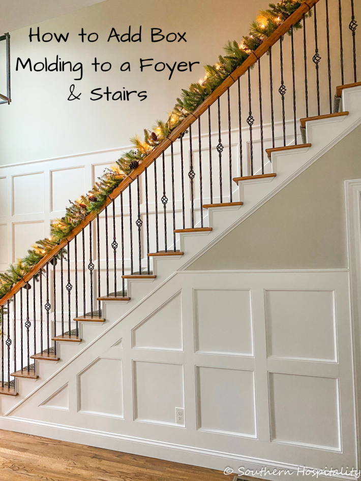 This is an amazing step by step tutorial on How To Add Box Molding to Stair Wall.   Their tutorial is really detailed.