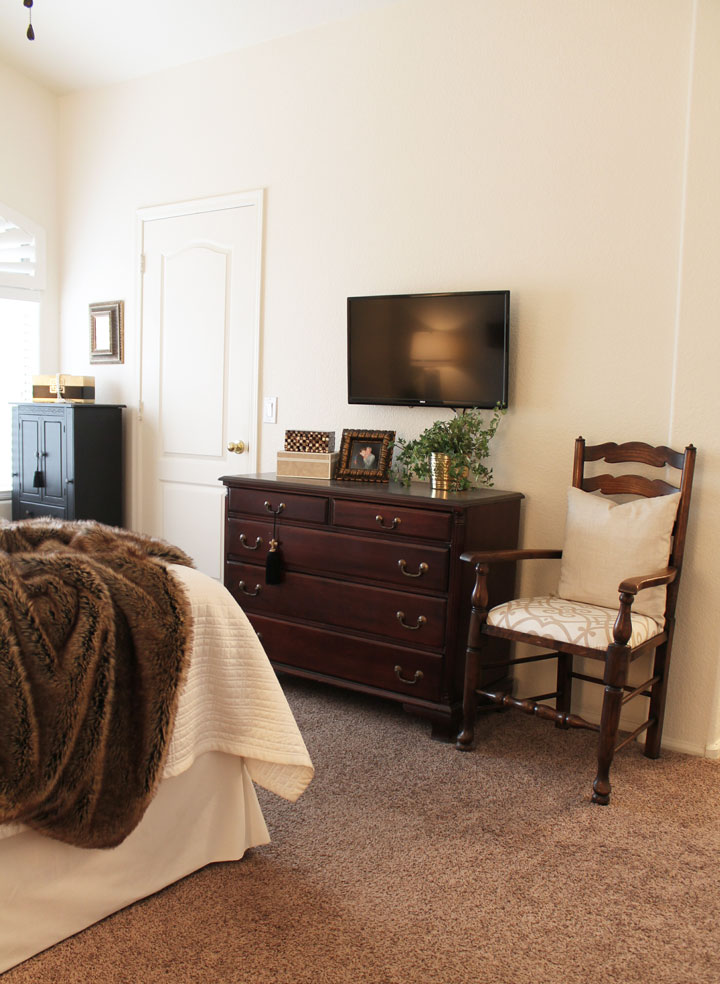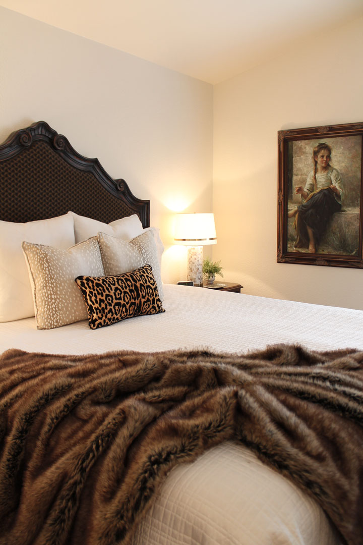 We’ve been having such a mild and warm winter, then all of a sudden Mother Nature had a change of plans. Things are getting cold for us. Now I’ve lived in the mountains of Oregon where we had snow measured in feet not inches for months at a time, so I know cold. In the desert where we are able to survive temps of 115 to 120 degrees, when the temps get down to the 30’s at night and a high of 50ish, then we are cold. Out come the sweaters and coats and we bundle inside and turn on the heat. Time to cozy up the house, especially the bedroom. Furniture doesn’t move around, but pillows and accessories do. I brought out some fur to make this space feel warmer and cozier.