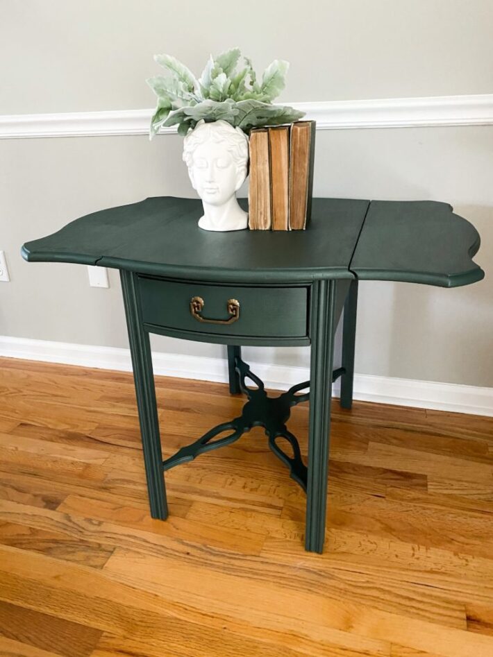 Green is such an “in” color at the moment and this new custom color green is amazing. Love this table makeover. Be sure to see all the details.