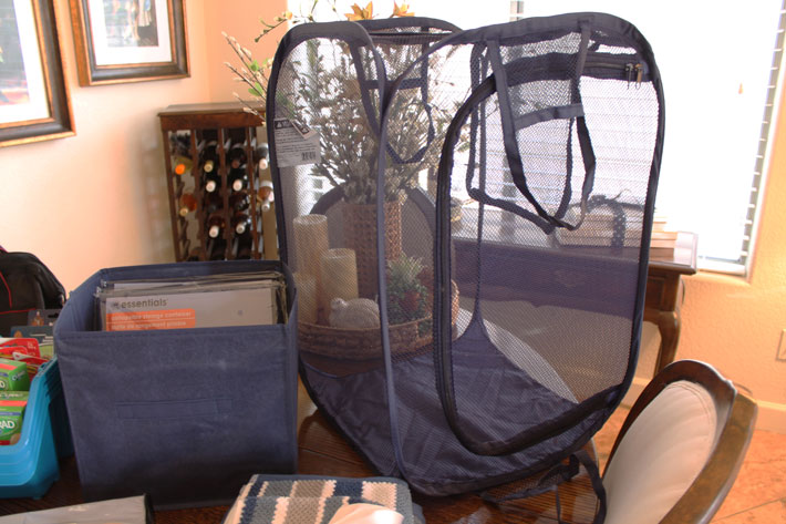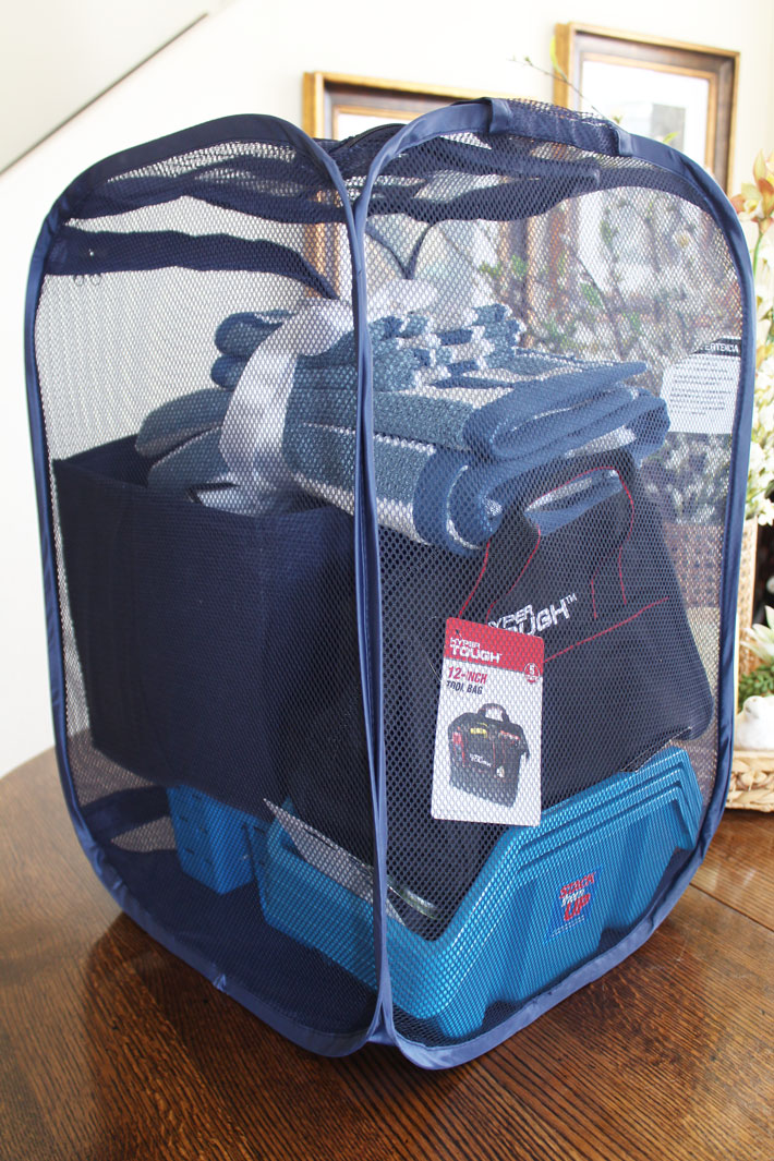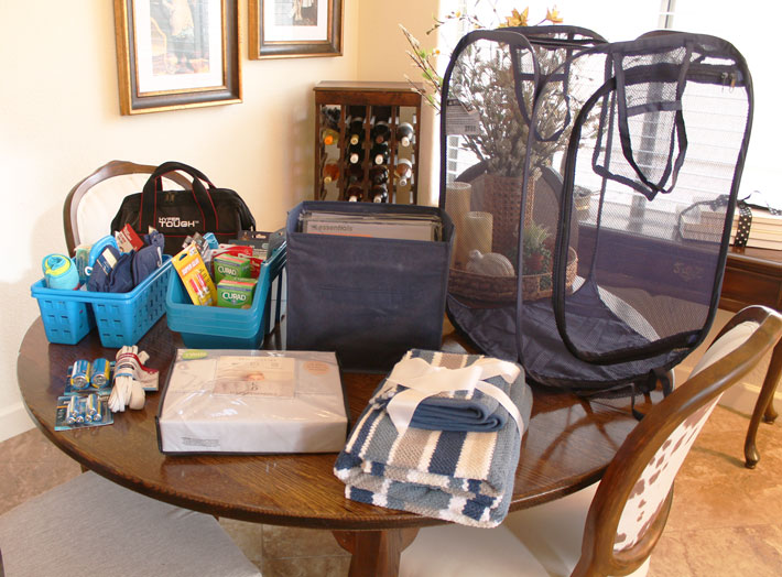Space will be an issue, so I started with a collapsible clothes hamper.  Dirty clothes need to be contained.  Then I decided to fill it with all kinds of basics that he might need.