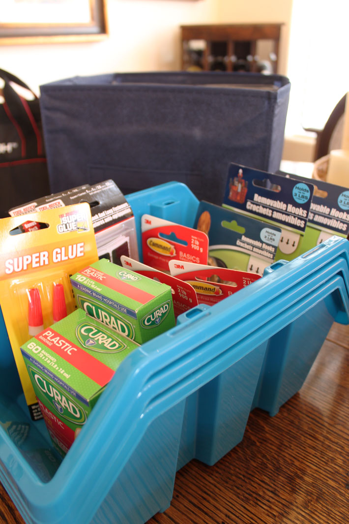 Plastic stackable storage bins are always super handy, so I got him three of those.  Inside one of them I put a bunch of Command Strips, Super Glue, Velcro Strips and Bandaids.  Just some things he could use.