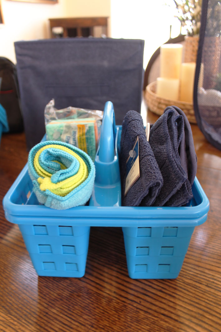 All 4 of these guys will be sharing one bathroom, so he will definitely need a bathroom caddy for his shampoo and toiletries.  I got him two so he can use them for whatever.  For now I filled one with sponges, cleaning cloths, pot holders and dish towel.