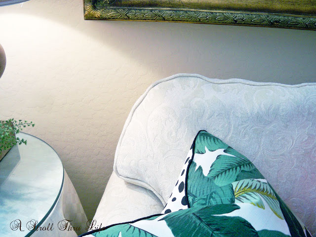 The point I am trying to make is how fabric whites can look against paint color whites. Swiss Coffee paint has just enough various undertones that both my chair and sofa look good.