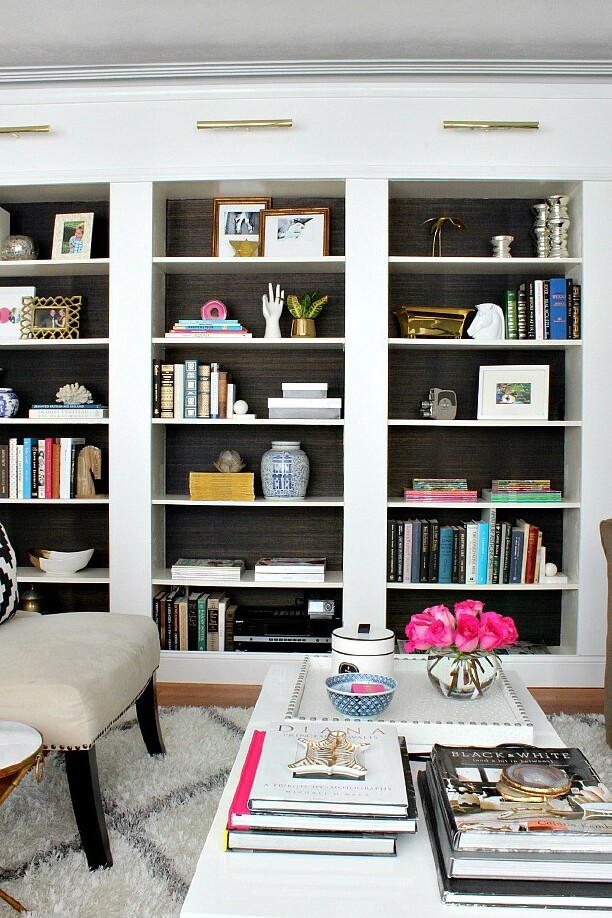 I love how Bliss @ Home lined the back of her bookcases with dark grasscloth.  This creates a really dramatic focal point to showcase all of her displays.  Notice how she uses family photos and collectibles mixed in with her books and accessories. Check out some fabulous posts on How To Style Bookcases – Tips & Ideas.  These amazing bloggers have so many great step-by-step details to share.