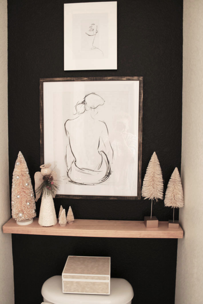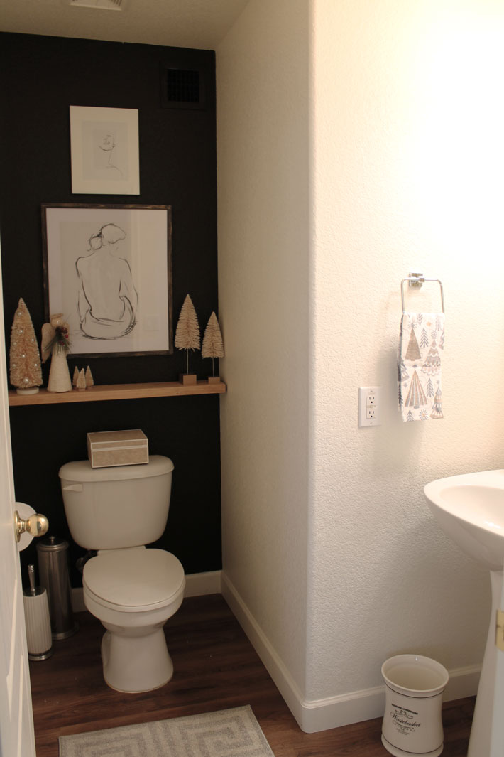 When I did the Powder Room Makeover earlier this year, it was so fun to see the room come together. Builder grace bathrooms are really not much to see, so the black wall and all-white accessories gave the room a little character. Keeping with the black and white theme for Christmas was just what this little room called for.