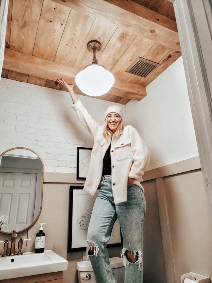 I love this DIY Wood Plank and Beam ceiling for this bathroom makeover.  Check out the tutorial.
