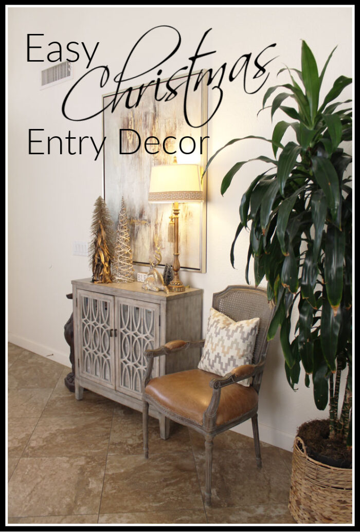 We don’t really have an actual formal entry, but I love being able to create one right inside the door. A pretty console, art, and a plant create the perfect Easy Christmas Entry Decor for this two story wall.