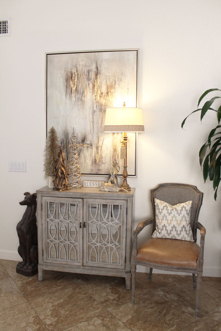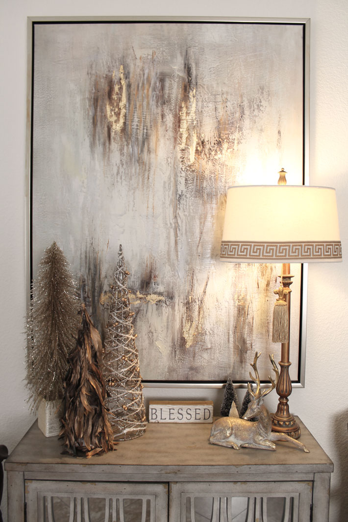 I love this painting. I needed something tall and this piece is perfect. (You can check out my Easy DIY Art Project here.) The colors of gray, beige, cream and gold go so well with the gray console. For Christmas, a collection of my favorite tabletop Christmas trees usually end up on the console. A Blessed sign and a resting reindeer finish off the top. ( You can also check out my post about customizing lamp shades and chandeliers here.)