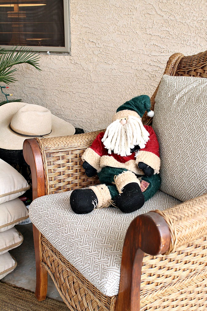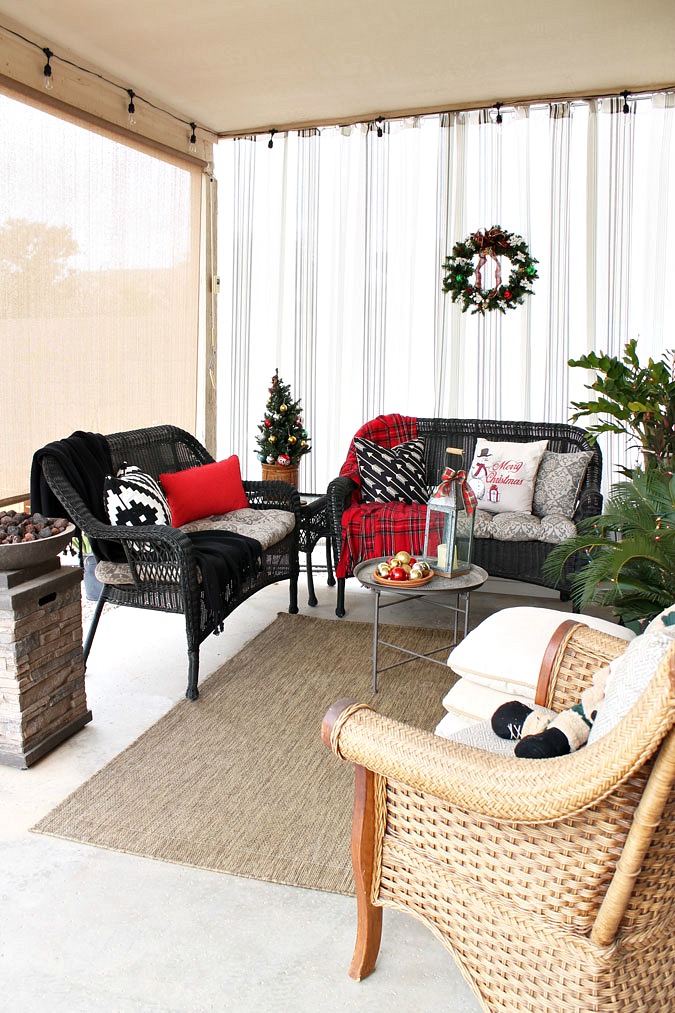 It doesn’t take much to make the patio feel comfy and cozy for Christmas.  The curtains and sunshade create such a cozy “room”.  The sun shade still lets us see the whole backyard and especially around the pool.  If it’s a little chilly, then we just light up the firepit and we are toasty warm in no time.