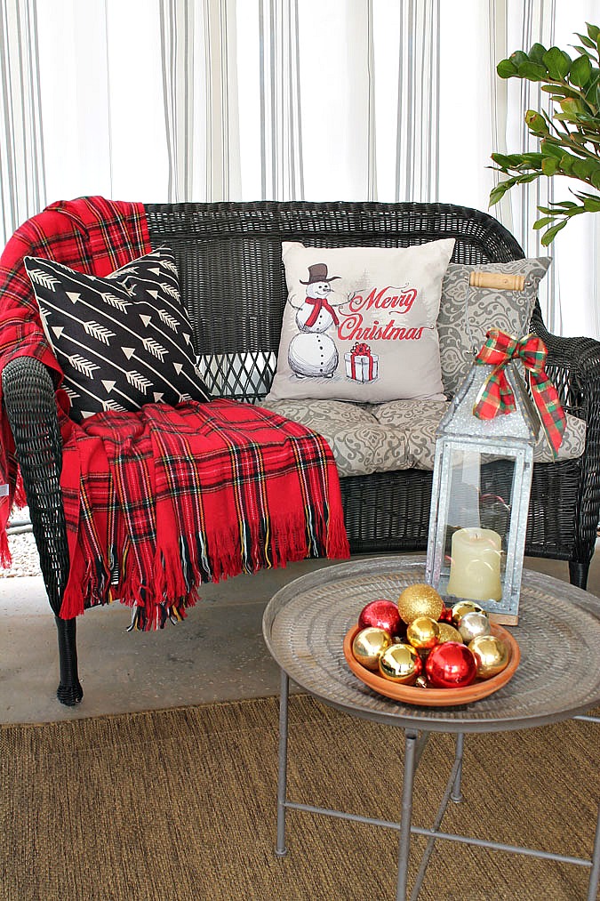 I pretty much do the same thing every year.  A few Christmas pillows, a cozy plaid throw, a fun lantern, and of course a bowl of shiny brights.