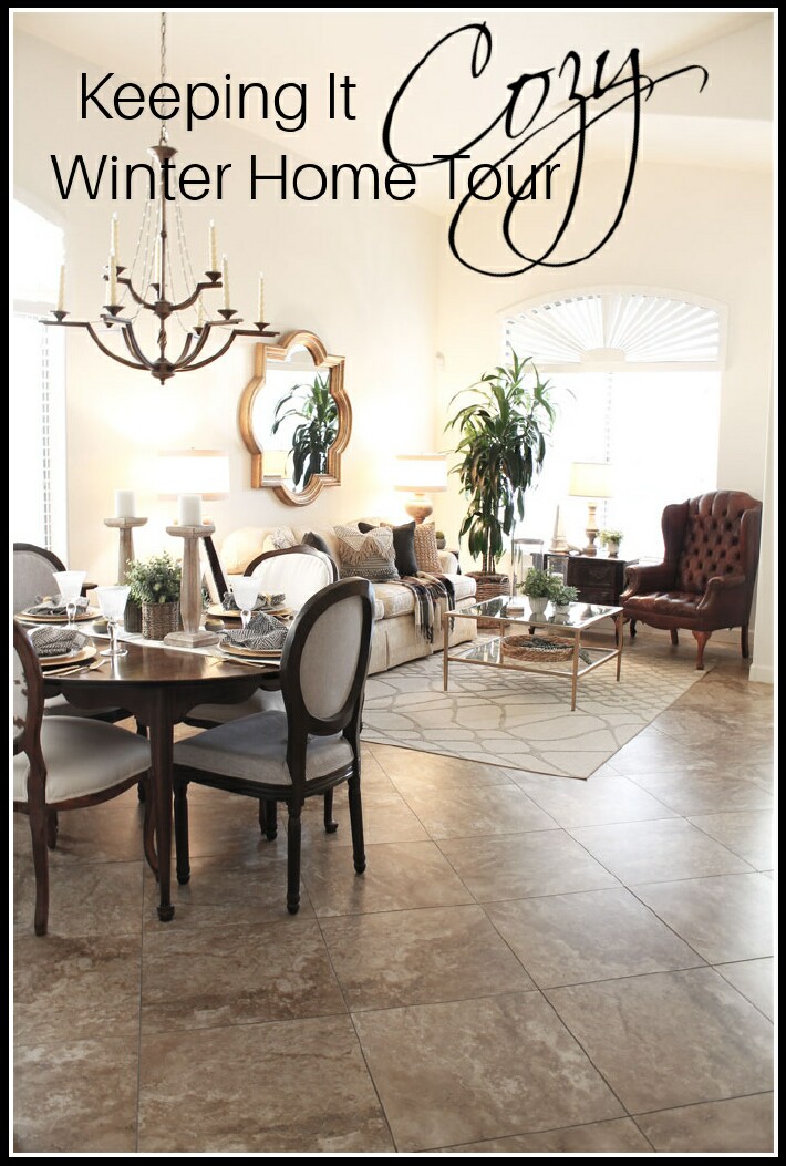 I am thrilled to be joining a great group of friends for a Keeping It Cozy Winter Home Tour. Thanks so much to Amber @ Follow The Yellow Brick Home for organizing all of us. With Christmas put away, time to clean things up and refresh some of the rooms. I like to start with the living/dining areas since that is what you see when you first walk in the door. Our Christmas was done with some beige, cream, brown, and copper. I thought a color change was due. I decided that I wanted to keep the leather chair here for a while, so I wanted a color scheme that still looked cozy and sort of masculine. Gray and a bit of soft camel seemed perfect to me.