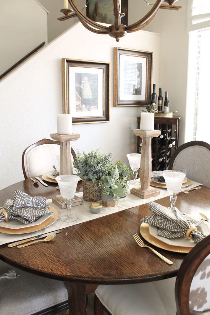 Candlesticks and some simple greenery. Place settings with gold chargers, gold flatware, and gray napkins.