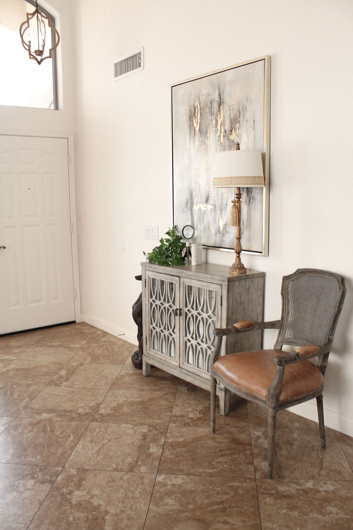 When you enter our home, you walk right into the living/dining area. This is a two-story area that looks up into the loft on the second floor. I use the interior two-story wall to create a sort of entrance with my favorite little chest and art. This is where you can drop your keys and packages, so it is the perfect spot to greet guests.
