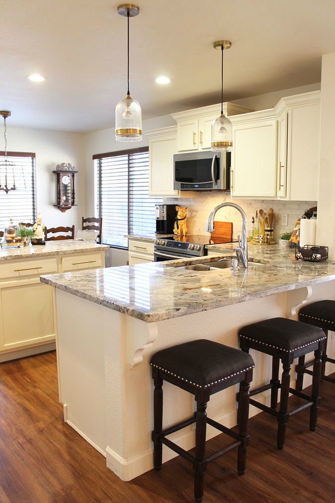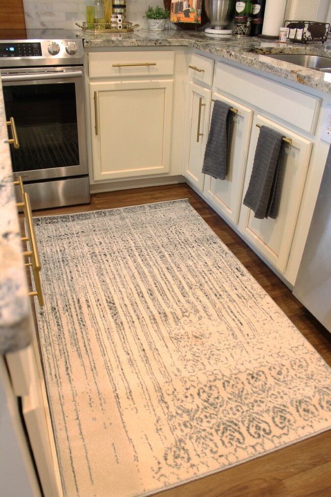 The New Rug Didn’t Work In The Kitchen – Fabulous For The Bathroom. If you are like me, sometimes things I see online and purchase look a little different when they get to me. I ordered a new rug for the kitchen thinking it was a soft gray background with a darker gray pattern. I spend a lot of time in the kitchen so I wanted a nice soft rug to stand on. I wanted one that would span this whole area between the peninsula and the island.