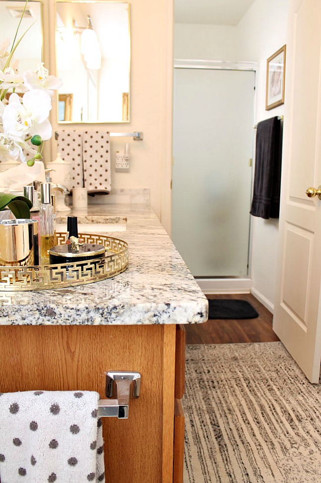 The size is 4 x 6 so I wondered if it might work upstairs in the master bathroom. Our master is a small galley type and I love having a rug to stand on when I get out of the shower. So upstairs I went and removed the rug I was using and tried out the new rug. It works perfectly and looks wonderful in here.