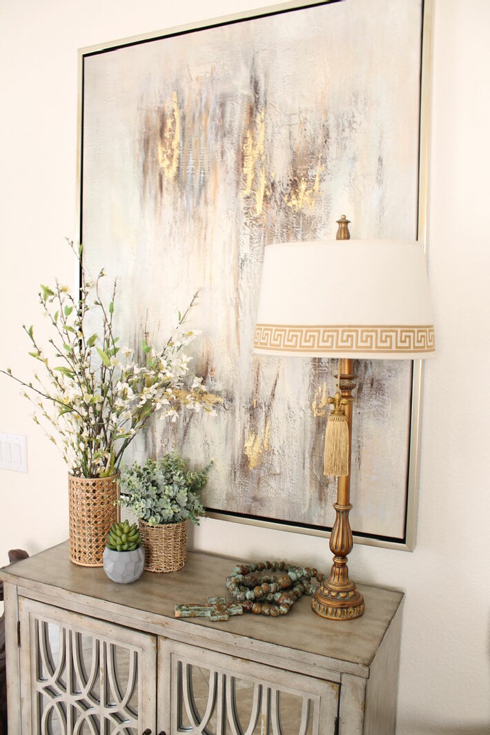 Since I am going neutral, I kept the tabletop decor really simple. Some buds and a favorite cross.