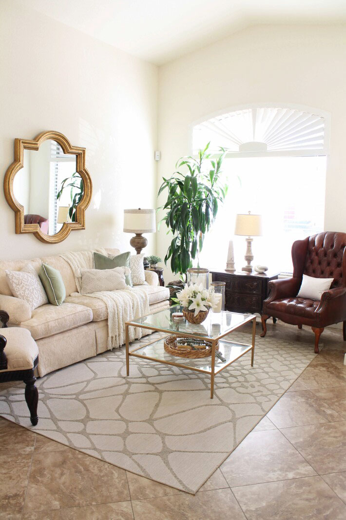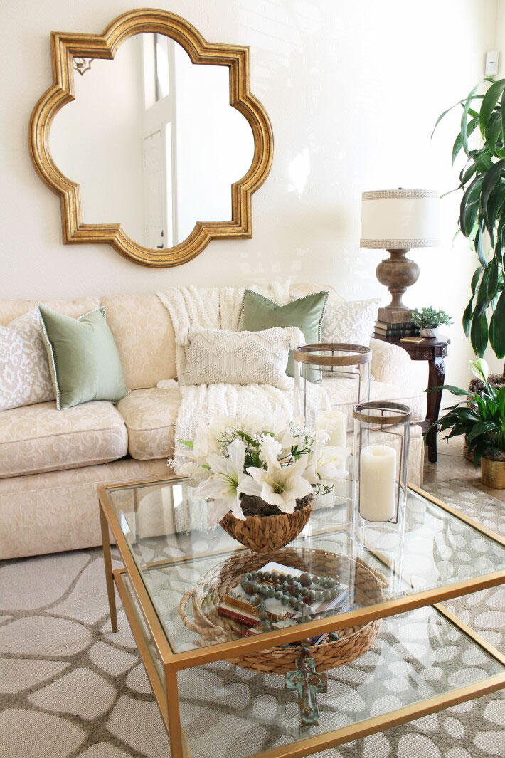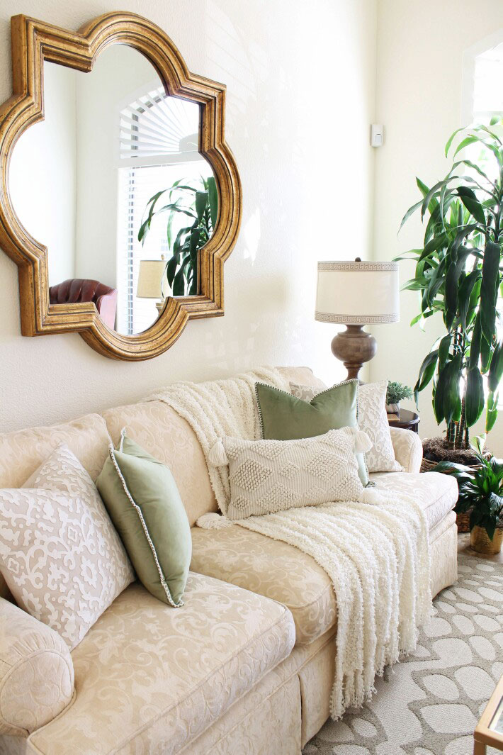 The sofa is where I used those pretty green pillows that caught my eye. Everything else is varying shades of white and cream.
