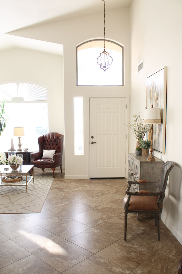 Let’s start at the beginning. When you enter my home you walk right into my two-story living/dining area. Our home has an open floor plan so you can see all the way into the family room area in the back and the loft area upstairs. Since there isn’t a real entry hall, I have a console table on the long two-story wall as you enter.