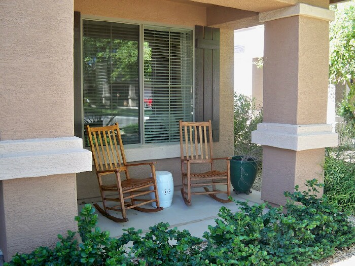 Time to really clean up the front porch again. Living in Arizona, I reserve the lawn for the backyard and have desert landscaping in the front. Last week I finally got around to giving the front a good cleaning again. Such an ongoing project. I hosed off the front of the house, cleaned windows, and really cleaned the porch. I love it when it looks all fresh and dust-free even if it only lasts about 10 minutes. We have farms about 1/2 mile away from us and they are constantly plowing and planting something. A lot of dust. I sanded and restained the rockers last year, so they still look pretty good.