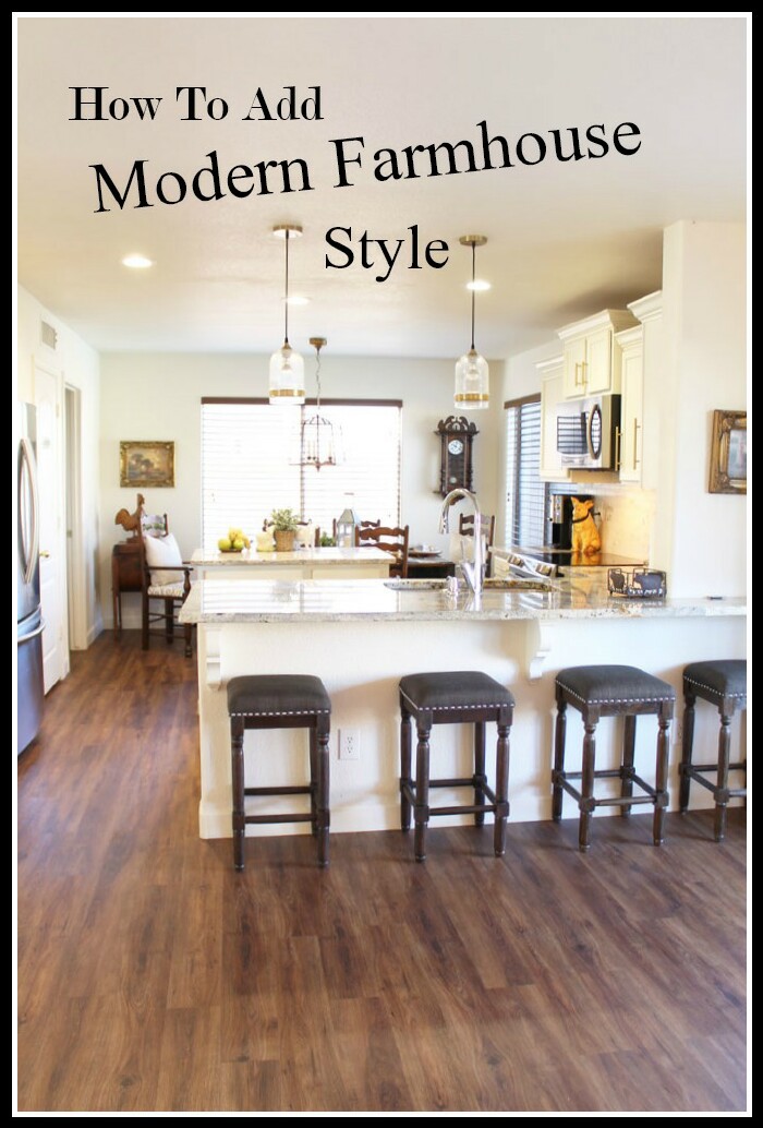 I have a little bit of Transitional style in my home and a bit of Modern or Contemporary style too. So my Farmhouse has always had a touch of Modern. Welcome to Home & Decor Encore! My friends and I have been blogging for many years, so we have a ton of fabulous content from the past. Home & Decor Encore is where we dig into our archives and bring back some old posts that we can update and make fresh or ones you might have missed or are new to you! Doreen from Hymns and Verses, keeps it all put together and us all organized. Today I want to share How To Add Modern Farmhouse Style to your kitchen and throughout your house. My kitchen is really pretty transitional, by adding a few farmhouse accessories, it takes on a totally different look.