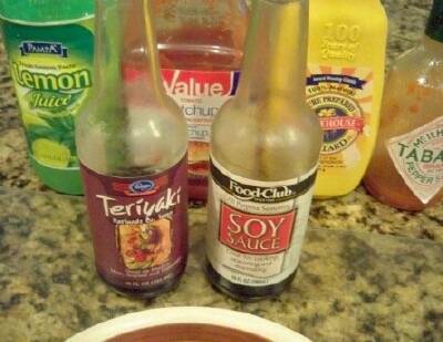 The basic ingredients are mustard, ketchup, lemon juice, tabasco, and soy sauce or teriyaki sauce. Not shown but basic is brown sugar, garlic powder and salt and pepper.