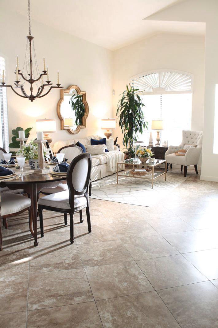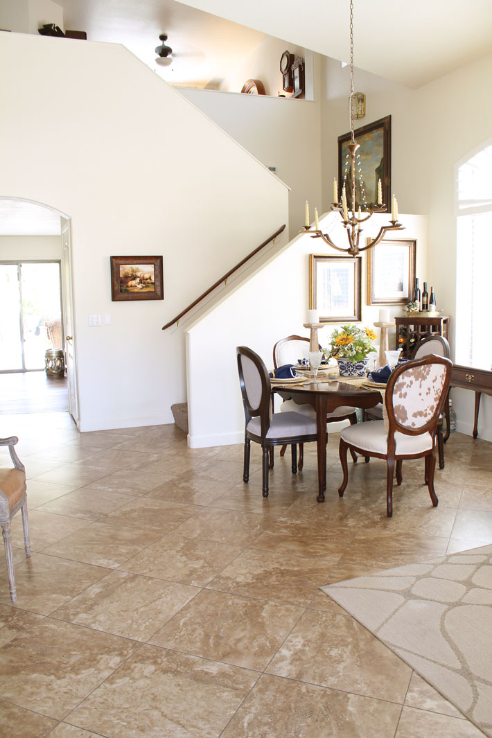 When you enter my home you walk into one large two-story room.  You see the living area, dining area, upstairs loft area, and the opening to the family room, kitchen, and outside.  Decorating this area seemed intimidating in the beginning, but I love how open everything is.