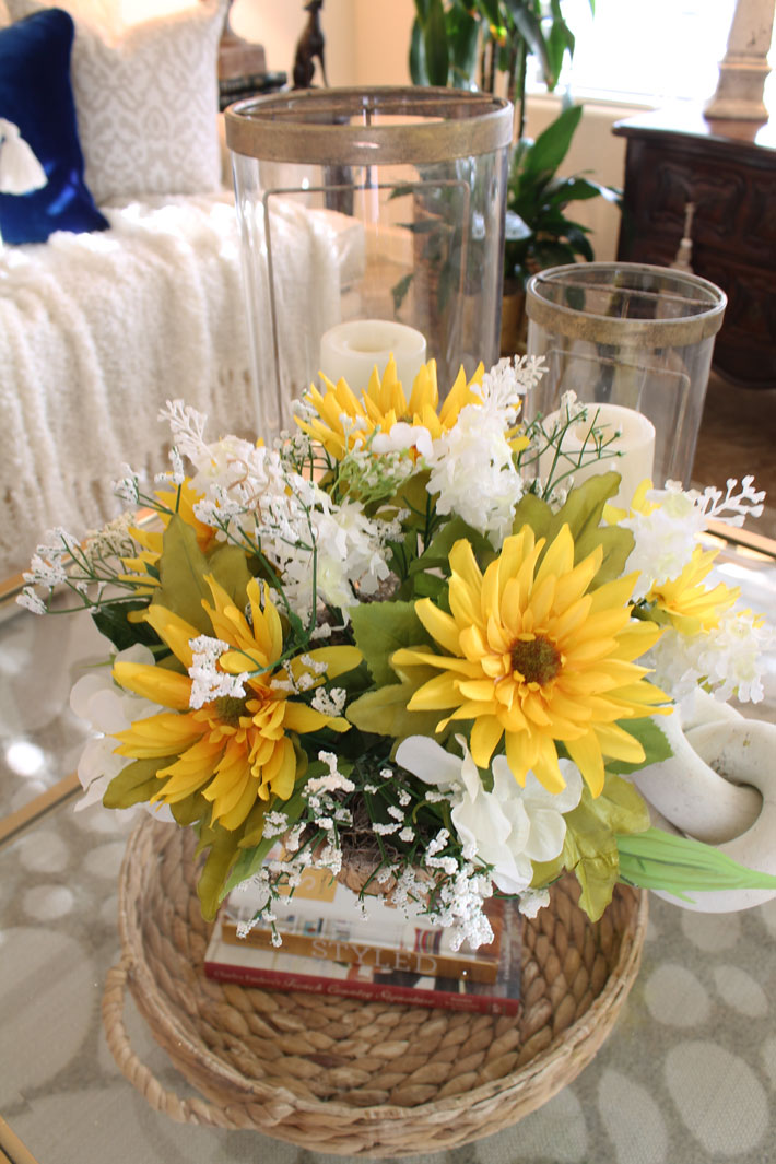 I kept the coffee table decor really simple with just a couple of candles and a basket of flowers.