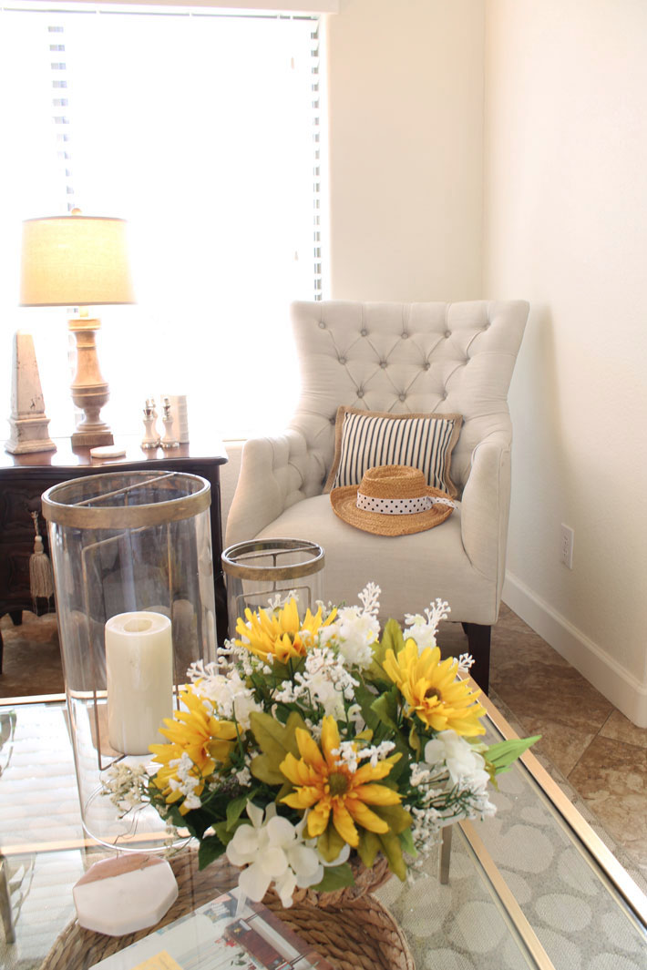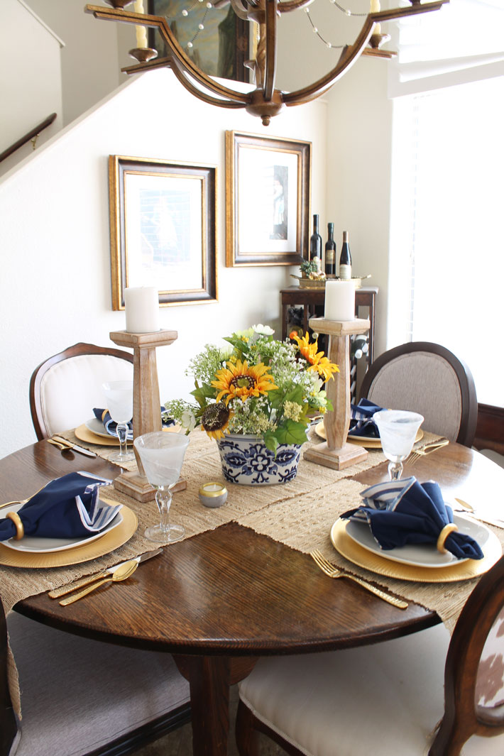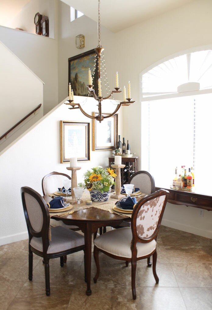 This looks perfect for Summer Marty. Large, tall spaces can be super daunting to decorate, but I think you nailed it! I also especially love the use of the blue and white vase with sunny yellow flowers as your centerpiece, as it definitely gives a Southern Summer vibe.