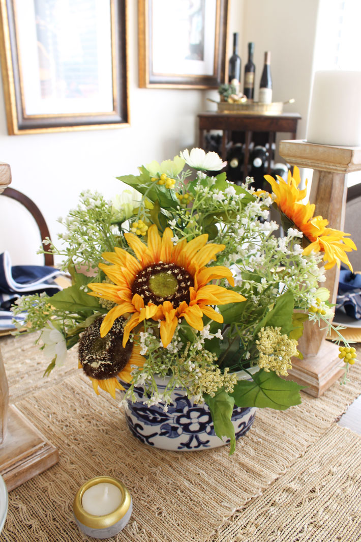 A pretty bouquet of sunflowers inside my blue and white cachepot adds some pretty color.