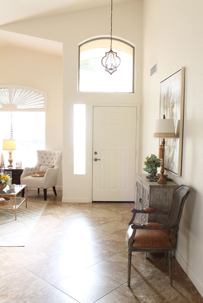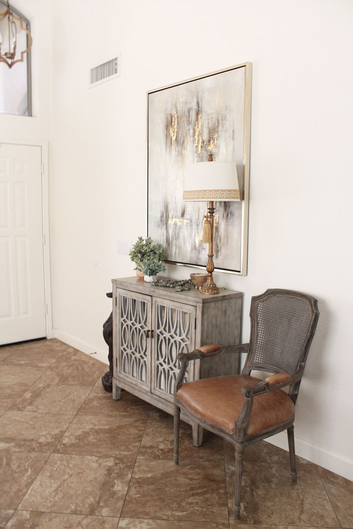 I’ve created a sort of entry on the left as you enter.  A pretty console, painting, and chair provide a place to drop packages, and keys and to sit down and take your shoes off.