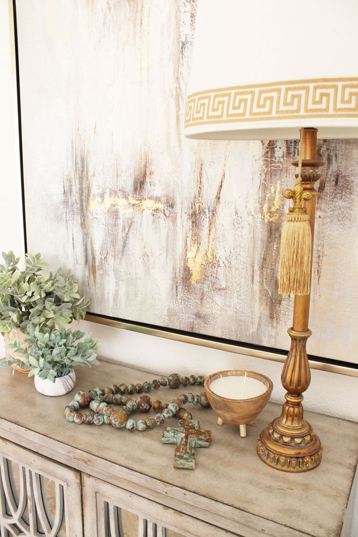 I’ve kept the decor on the top simple with a candle, plants, and my clay antique cross.