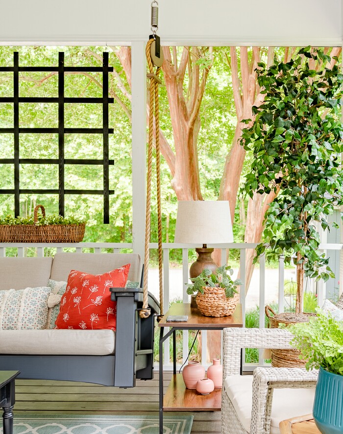 Worthing Court – I love Suzy’s amazing screened porch.  She mixes old and new seamlessly to create the best place to sit and relax the summer away.  She is so creative too,  notice the pully holding the swing ropes.