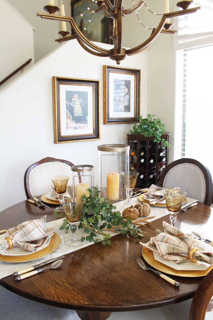 I also love the way foliage can create a sense of fall. Not one flower in sight, but adding a pretty pot of leaves and a lantern create the look and feel of fall. A simple ivy plant and two glass candle holders look amazing. A couple of textured pumpkins and antlers add in the fall touch.