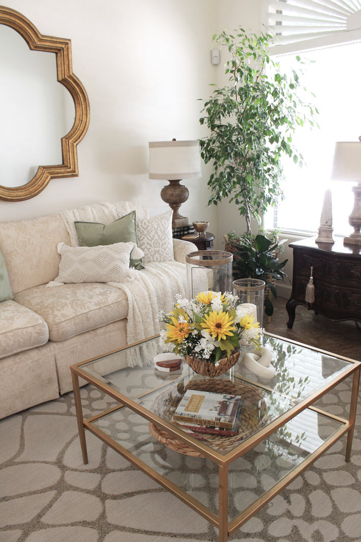 I mix real and faux all the time. In the picture above there are two real plants in the corner. A pretty ficus tree and a smaller plant in a basket in front of it. On the coffee table, there is a pretty faux ivy. It looks so real you would never think it was faux.