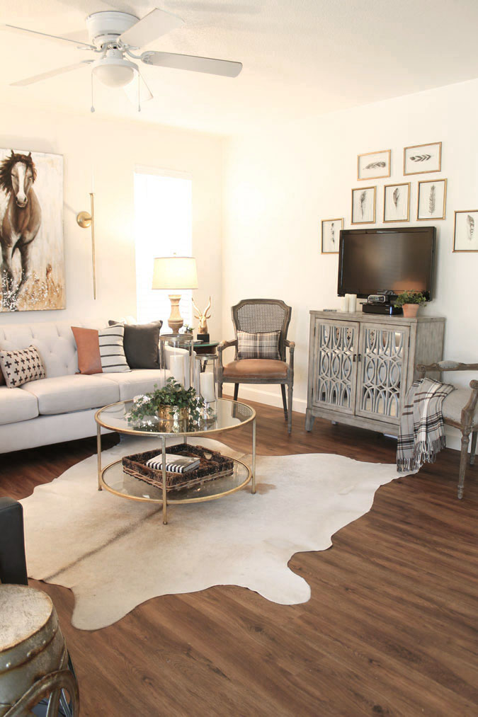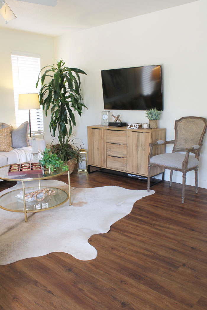 The real statement plant is of course the tree. It totally makes the room come to life. This room is small and too much furniture seems to crowd the space. I spent months trying to get this room right. The TV wall was a problem. This is one of the many arrangements I had on that wall. Nothing hideous, but nothing great either. That chair in the corner just didn’t add anything to the room.