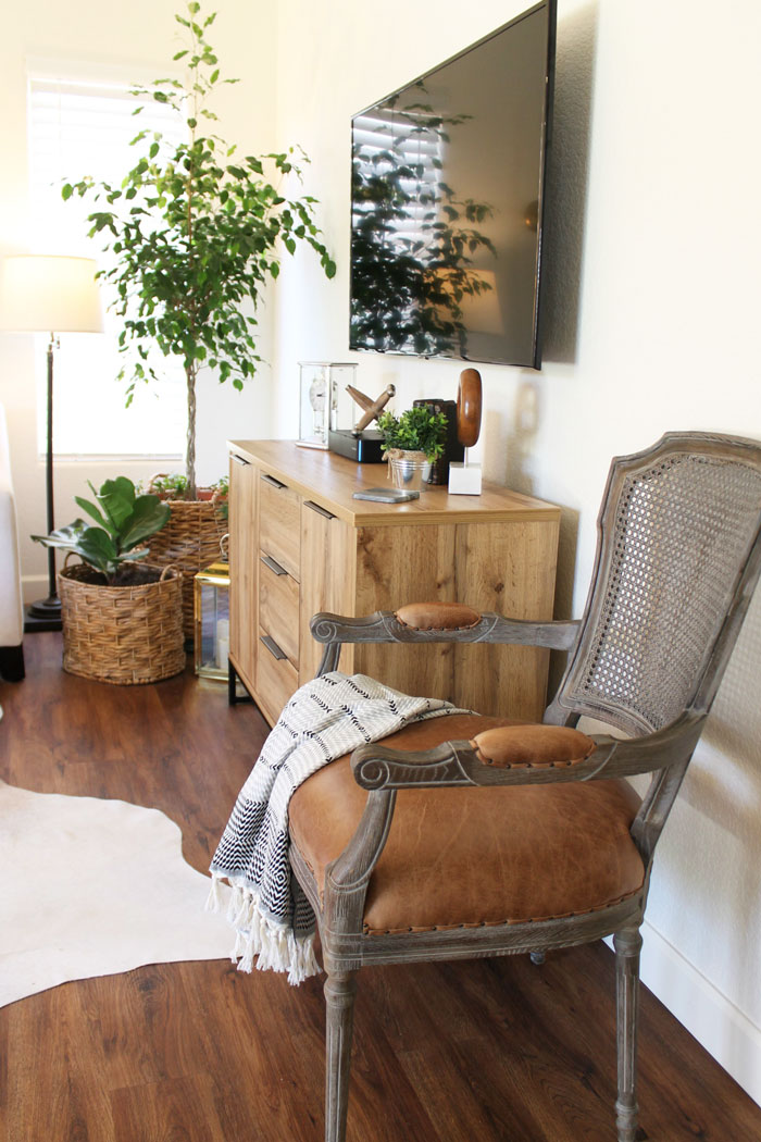 This picture shows more pattern and texture in the Family Room.  This is still a neutral color scheme, but the different fabrics (leather, linen, and velvet) and patterns in the pillows, a plaid throw, and even the cowhide rug all add to the pattern and texture making sure this room has something interesting to see.