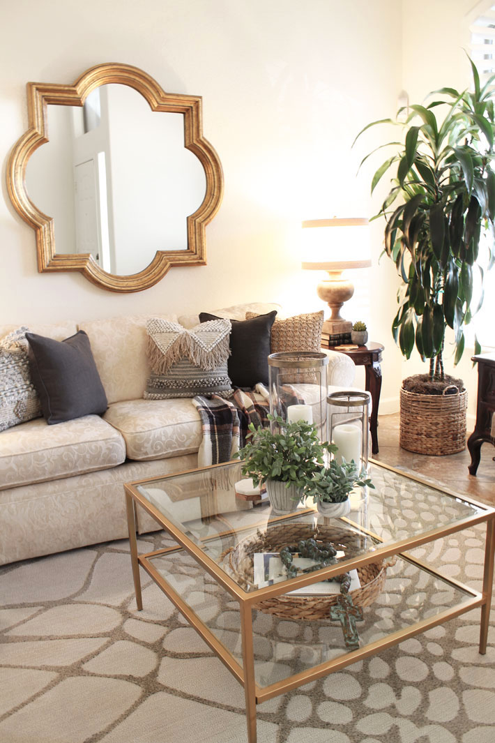 This room is light and bright for Fall but just look at all the Pattern and Texture it has.  Pattern and Texture in the pillows and the plant, beads and basket on the coffee table add more texture.