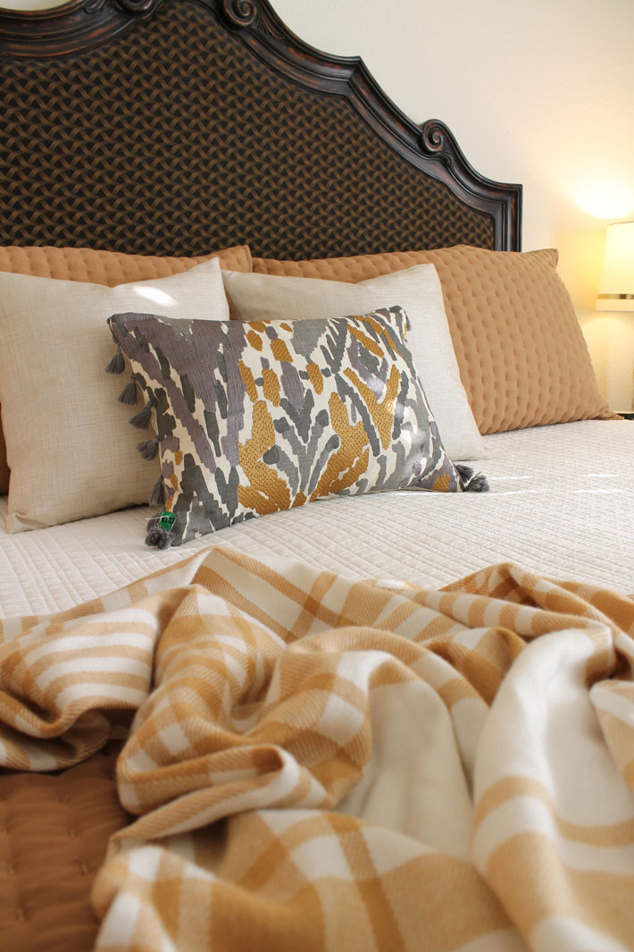 For Fall I like to layer a Camel quilt across the foot of the bed. I double up on the shames too by using both the white and camel.