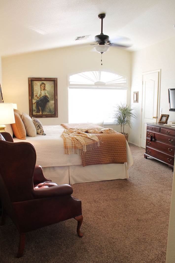 The door next to the window is my walk-in closet. There is another 6ft. sliding door closet next to the entry door. Our dresser and a second chair are across from the bed and then there is the opening to the master bathroom to the right of the chair.
