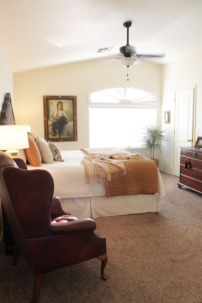 Adding Fall Room by Room is the way I love to switch things out for the season. This season I am starting with the Master Bedroom. I got some pretty new Fall Decor for my birthday two weeks ago, so I couldn’t wait to start spreading it around the house and creating a pretty Fall Inspiration room. I love how the sun shines into this room in the morning. It just wakes the whole room up. Our big windows are one of the things I like most about this house. Our master bedroom is a nice size, just hard to photograph. It is long and narrow. This is what you see when you are standing in the doorway.