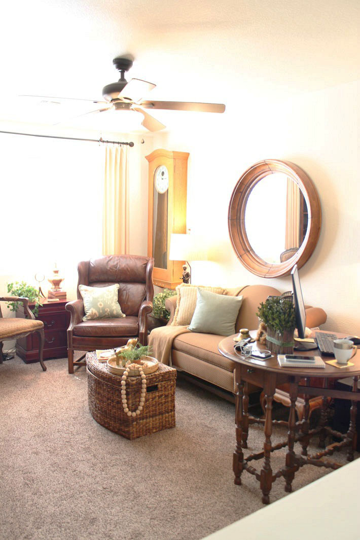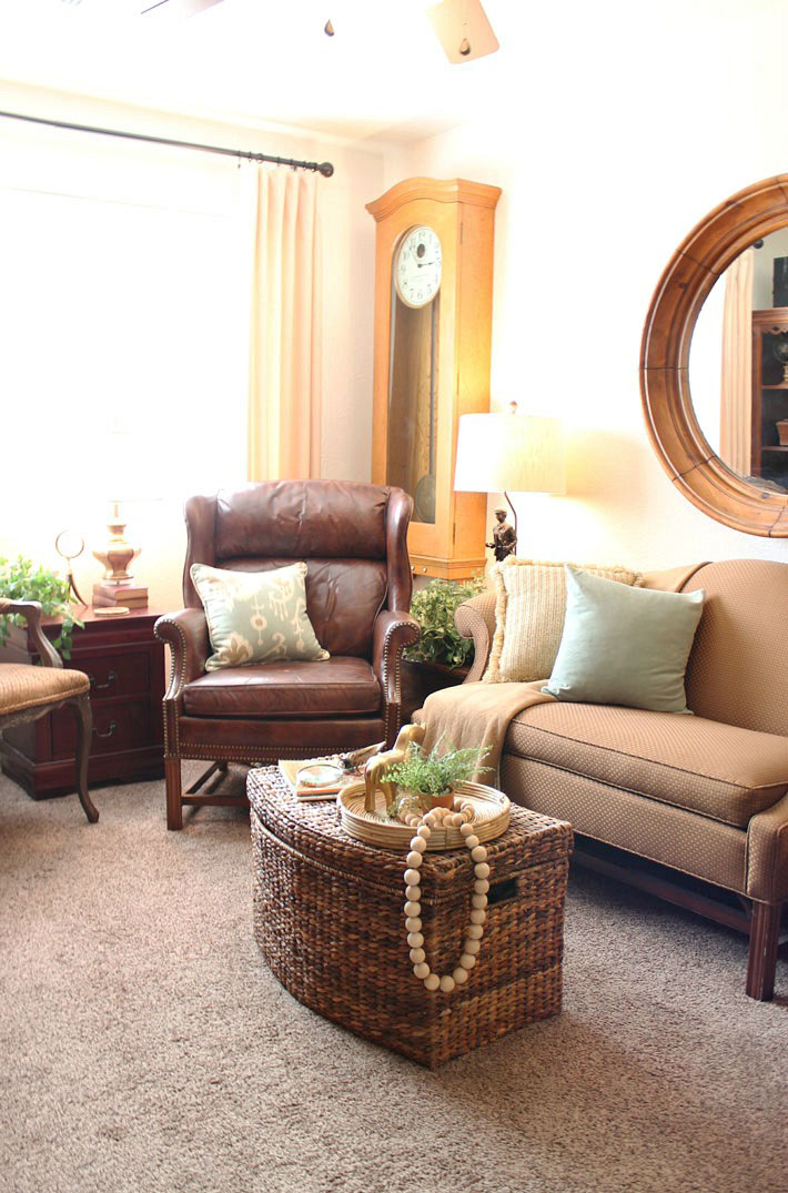 I love the loft area in our home. It is where I set up my office space and a comfortable seating area where I can read a good book or watch one of my favorite TV programs. All the furniture in this space didn’t find a home somewhere else when we moved in. Lucky for me because it turned out perfect for the loft. A comfy leather chair, a little settee, a few end tables, and more of my clock collection and this is one of my favorite rooms.