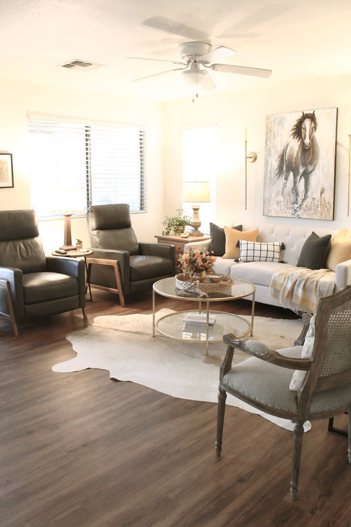I just love everything about this space in your home! I can see why everyone always wants to gather here! The horse painting flanked by the sconces is beautiful. And I love those chic recliners!