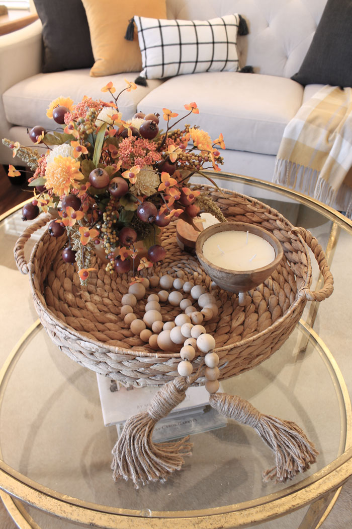 The coffee table got a refresh too with a simple bouquet and candle.