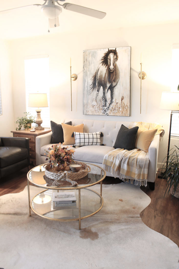 My horse painting takes center stage in the room.  Keeping the walls simple with just a painting and sconces makes the room feel larger too.  Less distraction for the eyes.