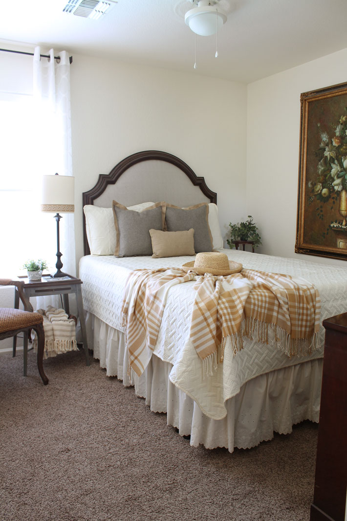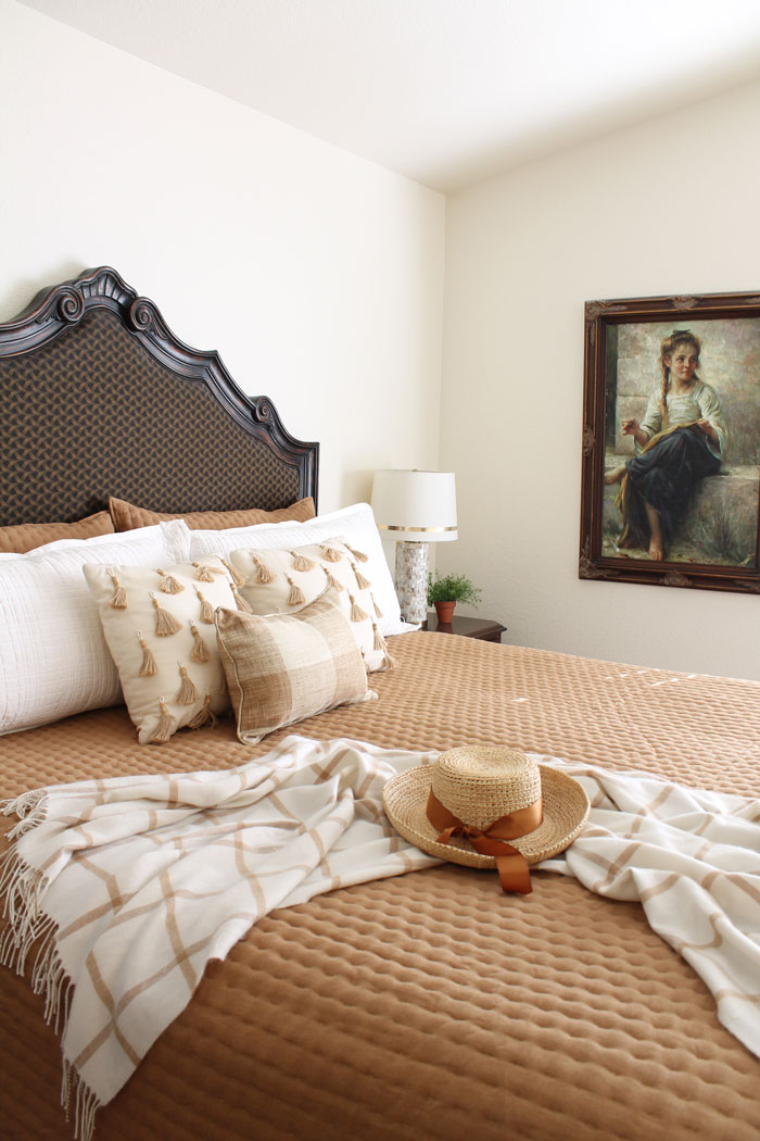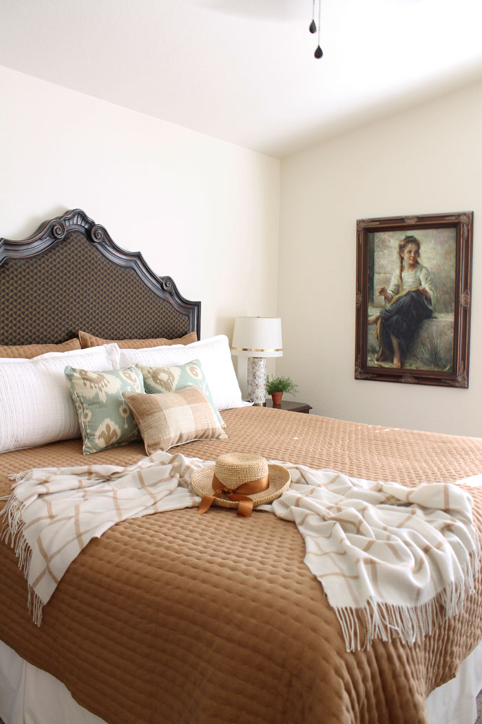 In the late spring or early summer, the camel quilt is perfect. It adds just enough color to the room. (You’ll notice that the chair was replaced with a leather wingback that I love. I swap the white and leather chairs in the living room and bedroom from time to time.)