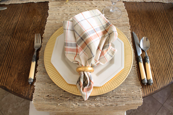 The centerpiece of this tablesetting is really simple, just a nod to the fall holiday season with a few pumpkins.