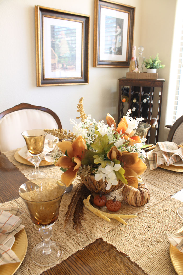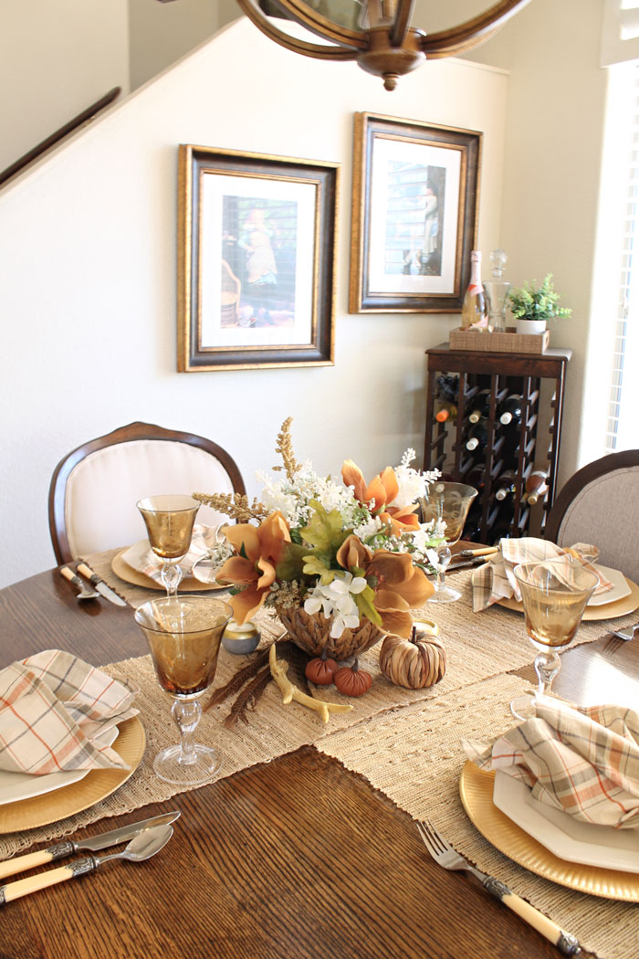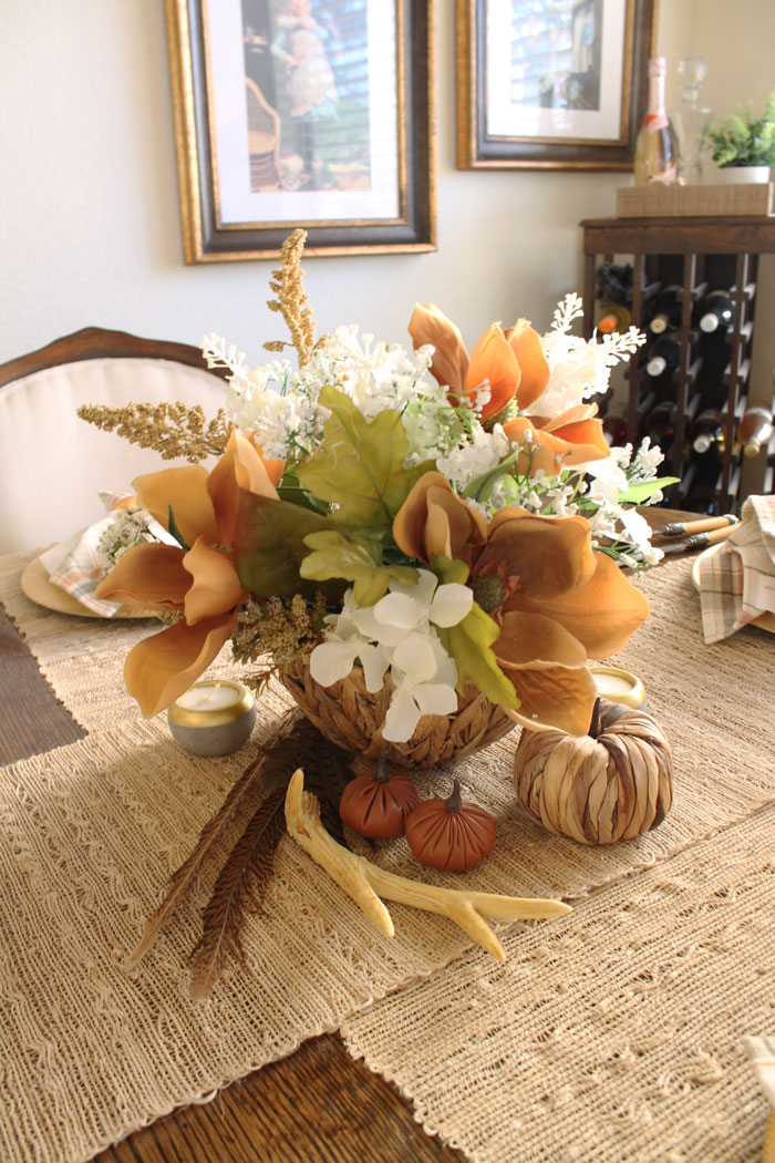The basic tablesetting is one that I can use with just a few changes. I love the two crossed tablerunners and the gold chargers and napkins will work really well for my Thanksgiving table. If I swap out a few things, I can create a totally different table. First off is to remove the ivy, stemwarea and candles. This give me a fresh base to start with. I had a pretty Fall Floral arrangement on the coffee table that I think I will move to the table. This adds a touch of elegance to the table.