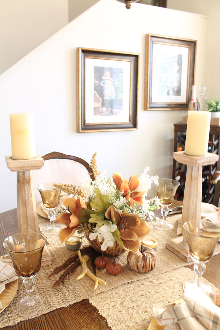 Marty, this is so lovely. The wooden candleholders are gorgeous with all the texture. Perfect setting for a small gathering. Have a wonderful Thanksgiving week!