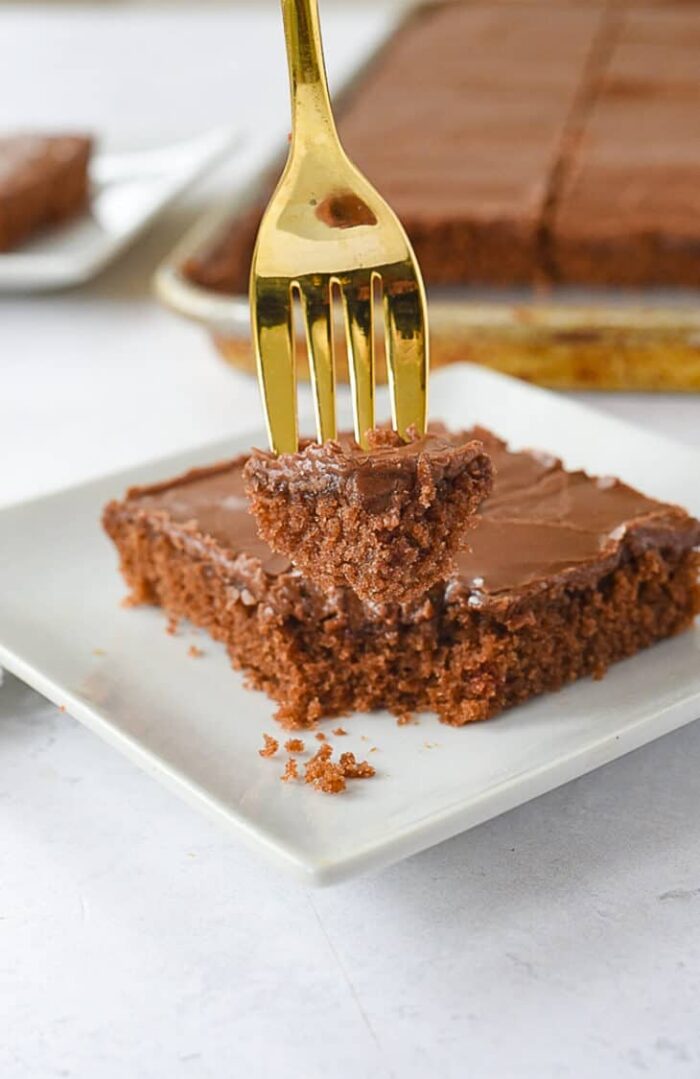 I remember my mom making the recipe below almost weekly for one reason or another. This was also super popular when a similar cake was made during the Depression when everything was rationed. This serves a ton of people and is so easy and fast to bake, plus how easy to just bake in a sheet pan and then take it with you.