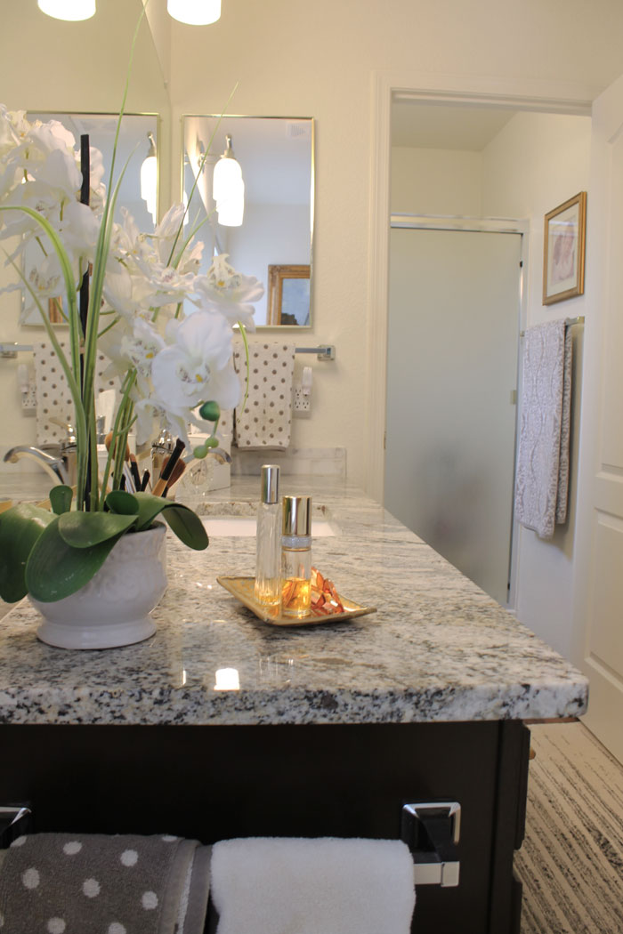 This side of the vanity I had a small tray with a couple of my favorite colognes, an orchid, makeup brushes and a candle. Clutter free, and simple.